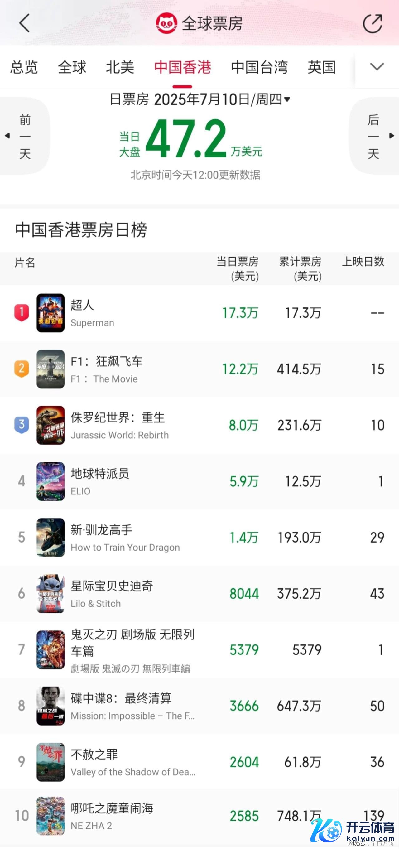 (1)单日票房榜前十的影片,香港原土电影有《不赦之罪》一部上榜,中国大陆电影有《哪吒之魔童闹海》一部上榜,好意思国电影有《超东谈主》、《F1:狂飙飞车》、《侏罗纪宇宙:新生》、《地球特派员》、《新·驯龙妙手》、《星际宝贝史迪奇》和《碟中谍8:最终算帐》等七部上榜,日本电影有《鬼灭之刃 戏院版 无尽列车篇》一部上榜。按照开画日历统计,上映首日的电影有《地球特派员》和《鬼灭之刃 戏院版 无尽列车篇》两部上榜,优先场上映的有《超东谈主》一部,其他七部皆是上映已久的老电影,尤其是《哪吒之魔童闹海》上映跳动130天,近日好意思国晓喻将对影片进行英语配音,海外影后杨紫琼担任配音演员,重来电影市集。