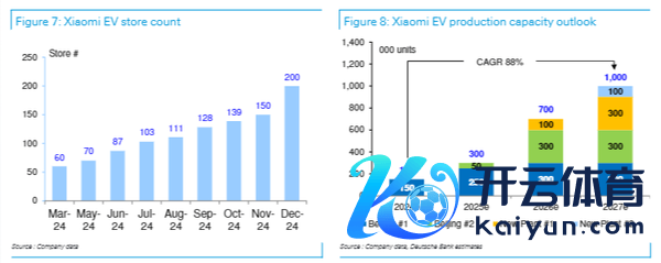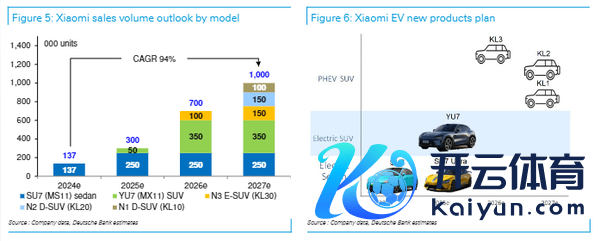 小米汽车业务的重点将放在SUV车型上,这一阛阓相较于轿车阛阓具有更大的发展后劲。小米计较在2025年中期推出名为“YU7”的纯电动SUV,德银瞻望该车型在2027年的年销量将达到40万辆。此外,小米还将在夙昔几年内不竭推出更多新款车型,包括全尺寸/大型SUV和插电混动SUV。