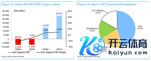 德银瞻望,跟着居品结构的不休完善和高价居品的推出,小米汽车业务的平均售价和盈利才略将捏续增长,2026年运行盈利。到2027年开yun体育网,小米电动汽车业务的毛利率有望达到25%,对总毛利和税前利润的孝敬占比将分歧达到45.5%和42%。届时,小米汽车业务将成为小米集团最大的业务部门。