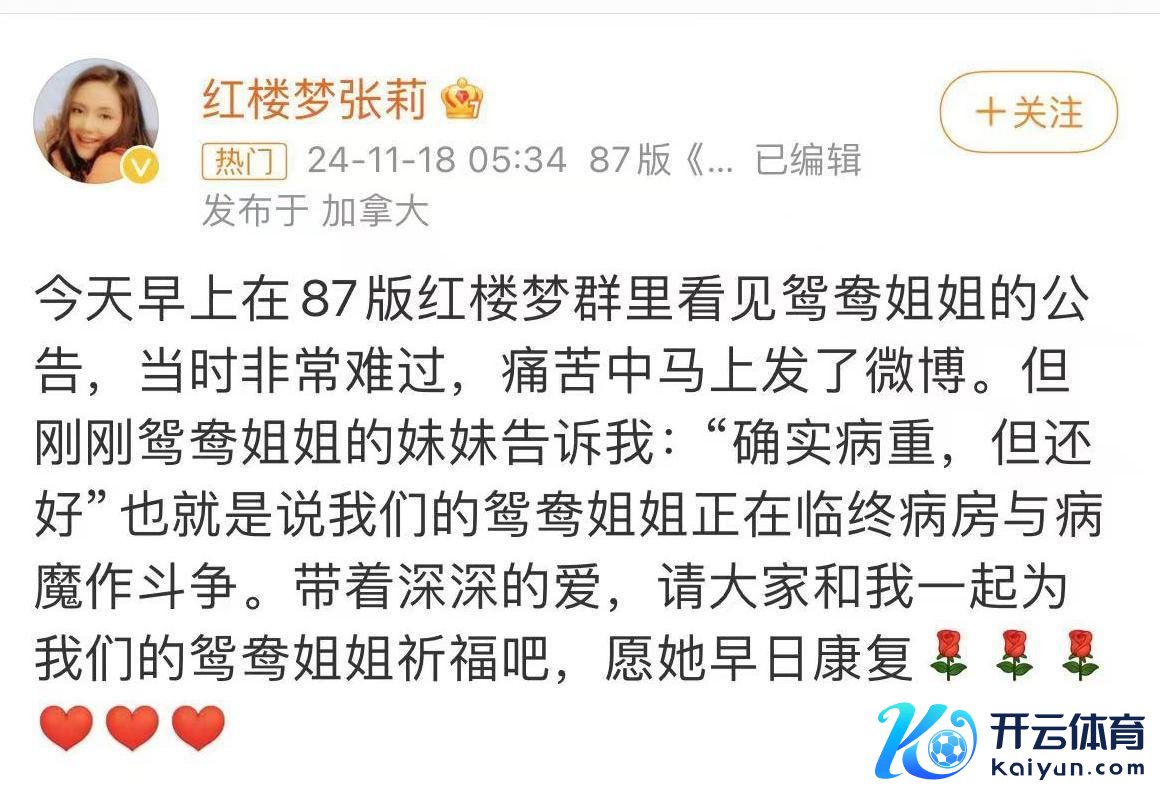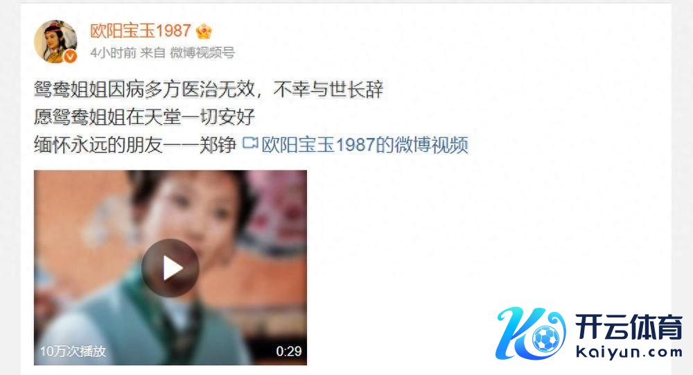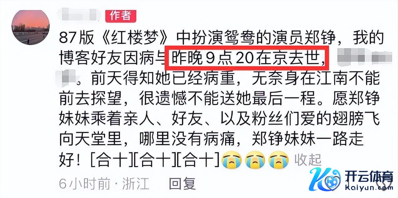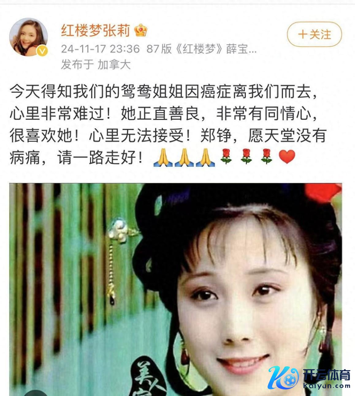 11月21日开云体育(中国)官方网站,文娱圈突传噩讯,著名女演员,87版《红楼梦》“鸳鸯”上演者郑铮物化,享年61岁。