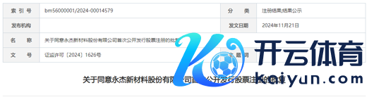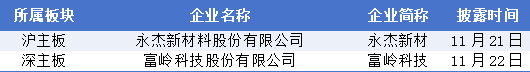 11月18日至11月22日历间,证监会败露了2家拿到注册批文企业的情况,差异为永杰新材料股份有限公司、富岭科技股份有限公司。