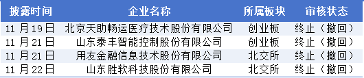 据统计,11月18日至11月22日历间,有4家企业休止(除去)IPO,差异为北京天佑畅运医疗技能股份有限公司、山东泰丰智能为止股份有限公司、用友金融信息技能股份有限公司、山东胜软科技股份有限公司。