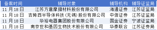 11月18日至11月22日历间新增辅导备案企业4家,差异为江苏方意摩擦材料股份有限公司、吉姆西半导体科技(无锡)股份有限公司、华裕电器集团股份有限公司、南京世和基因生物技能股份有限公司。
