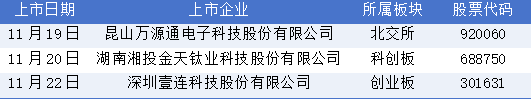 11月18日至11月22日历间,共有三家企业上市,差异为昆山万源通电子科技股份有限公司、湖南湘投金天钛业科技股份有限公司、深圳壹连科技股份有限公司。
