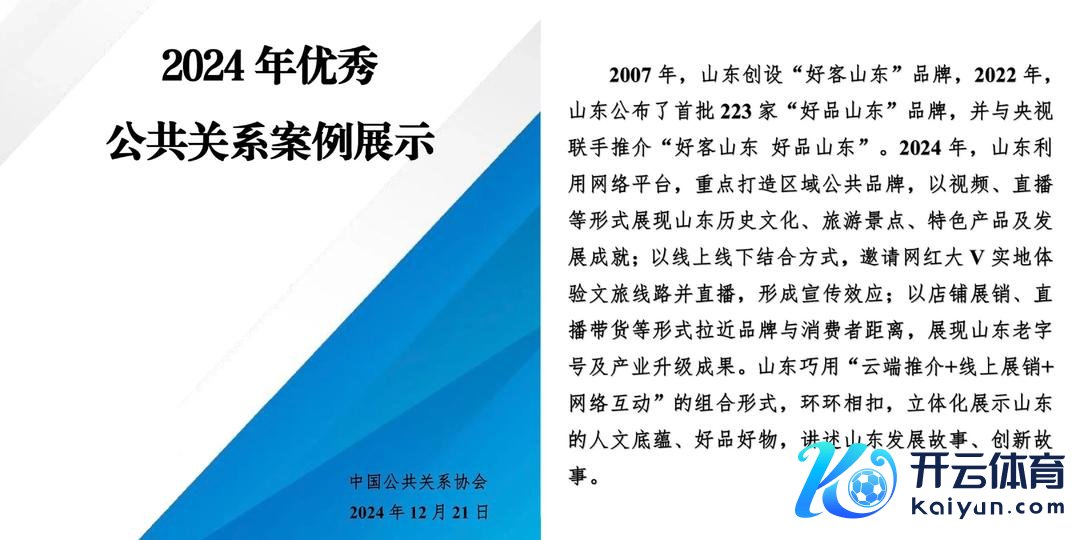 12月21日在北京举办的“2024中国大众关联发展大会”上,发布了“2024大众关联助力社会贬责当代化”优秀大众关联案例,共50个。山东省的“好客山东 好品山东”推介举止入选开云体育,并在现场作案例共享。