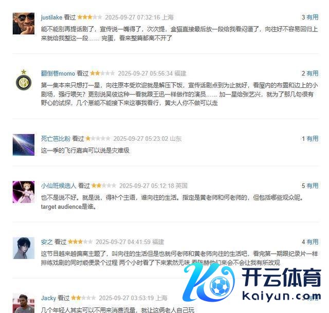 这期节目播出之后,在豆瓣短评区域,仍是酿成了连成一派的差评限度。以往的综艺节目,再丢丑,亦然差评和好评混合出现的。这一次的《向往的生存》,果然出现了差评和差评连成片,好评稀薄没几个的情景。濒临这些真实不雅众的大面积差评,黄磊等东谈主如实应该隆重反想了。 当今,不雅众们差评最多的开云体育(中国)官方网站,即是这一期节指标没趣。节目格局和骨子不错变动,但弗成让不雅众们嗅觉没趣。该节目在豆瓣的沟通区当中,致使于出现了一个条款,世界在沟通,看到这期节指标哪个技能段上,就关闭了电视机。有说看个开局,就合计没趣,关闭电视机的。也有说,看到他们排演话剧的技能,合计太没趣,关闭的。