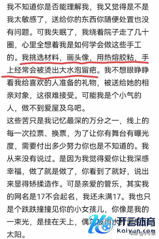 翰墨中,粉丝提到:这是我方第一次学着给别东说念主作念手工,并不是很熟练,但为了能让偶像可爱让管乐应许,她学着挑选材料、画头像,用热熔胶粘,手上频繁会被烫出洪流泡 ……