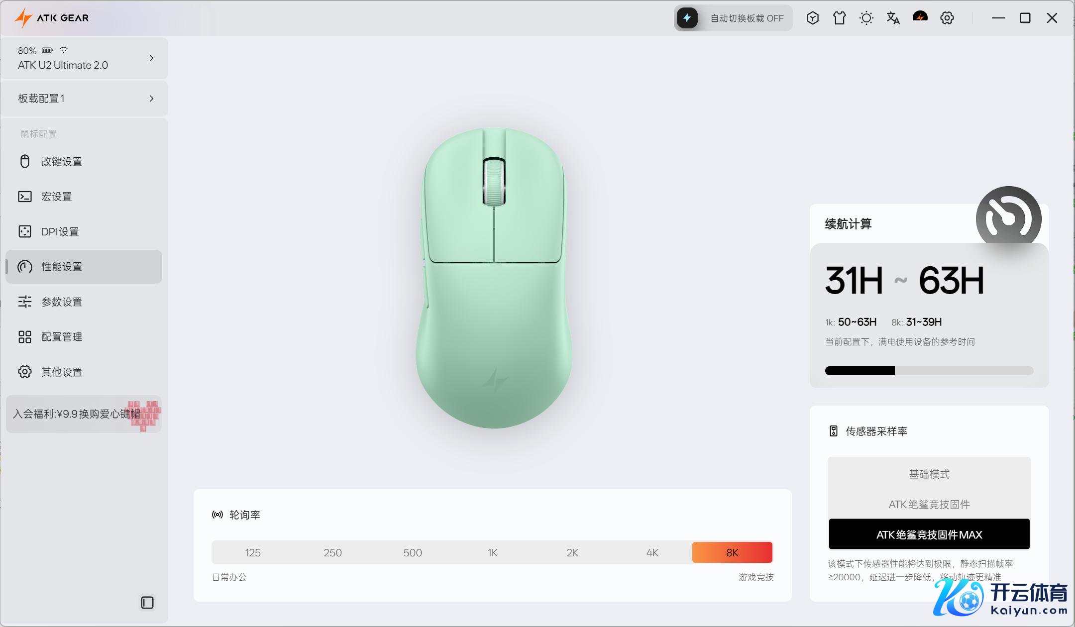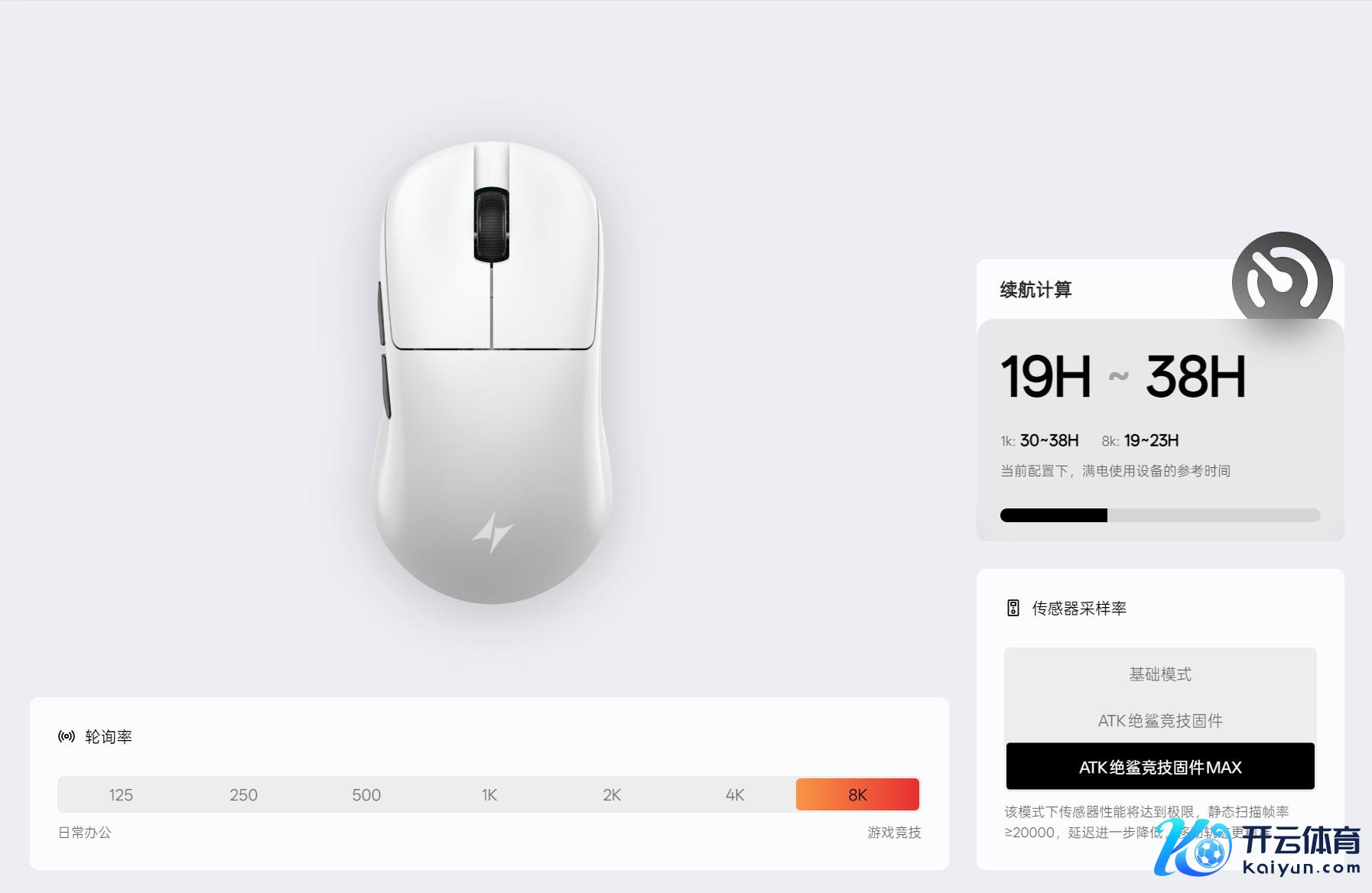 在运行中可以竖立为8K轮询率,同期采样率有三个档位,内置ATK自研的绝鲨MAX决议,这是一套基于Nordic54L芯片和领受器性能深度斥地的无线决议,静态扫描帧率可以作念到≥20000FPS,好意思满8T8R双向八轨的真双8K传输,同期可以作念到按键延伸低至0.181ms。