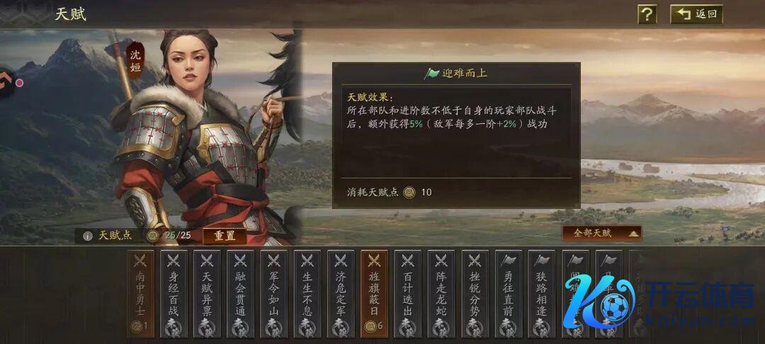 28、坚持不懈。耗尽10资质点。方位军队和进阶数不低于本身的玩家军队接触后,极度得到5%军功(敌军每多一阶+2%)