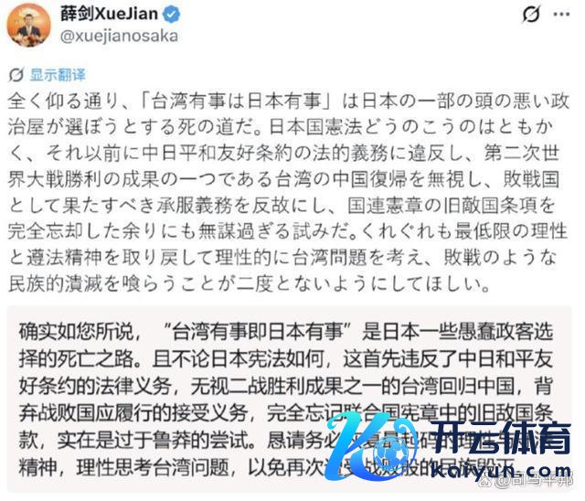 中国驻大阪总领事薛剑发文警告