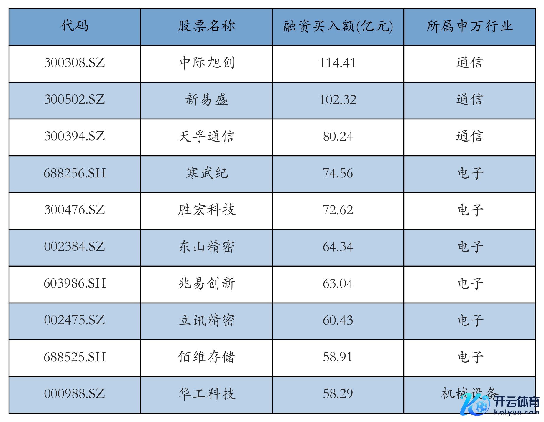 上周两市共有3489只个股有融资资金买入,共有130只个股买入金额超10亿元,其中中际旭创、新易盛、天孚通讯名次前三,买入金额永别114.41亿元、102.32亿元、80.24亿元。融资买入额前10个股确定见下表: